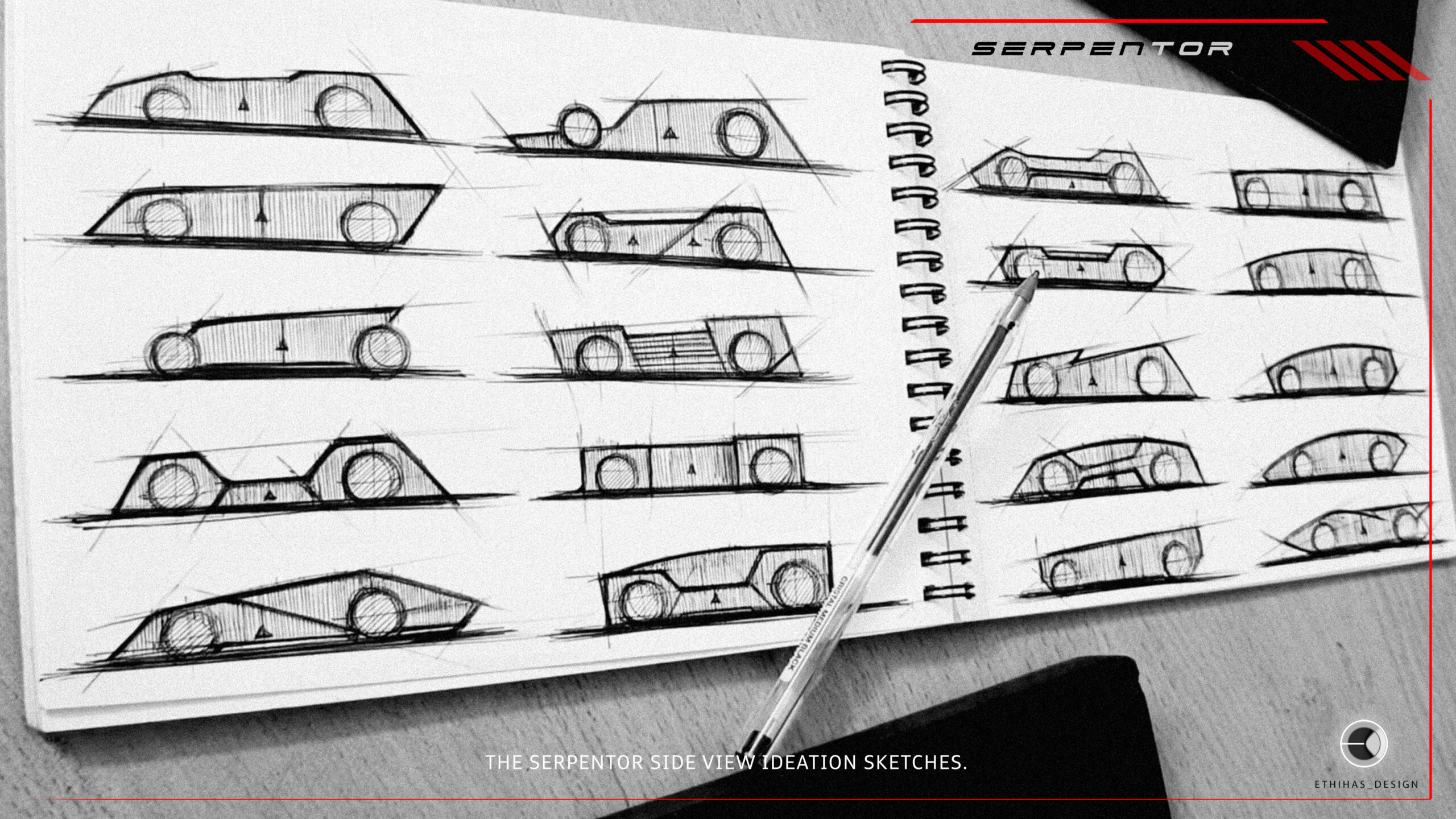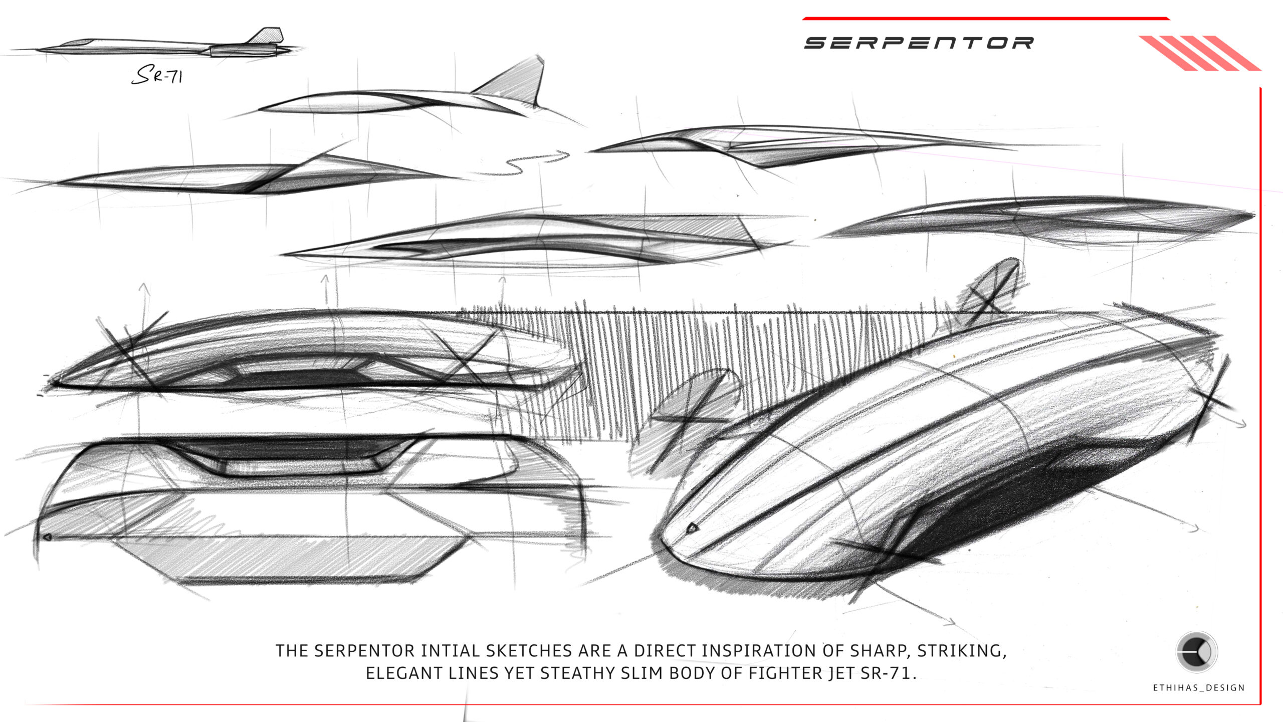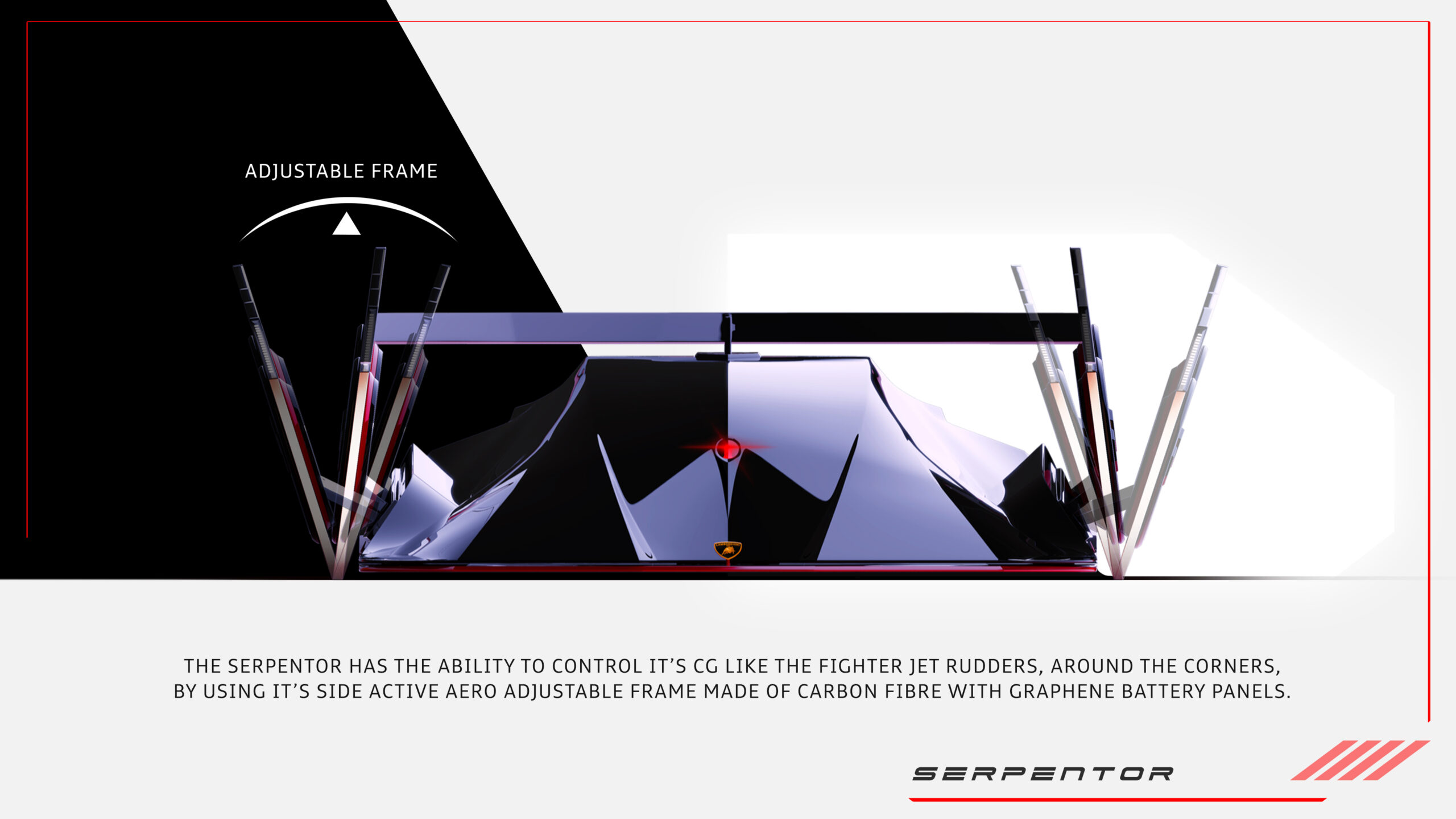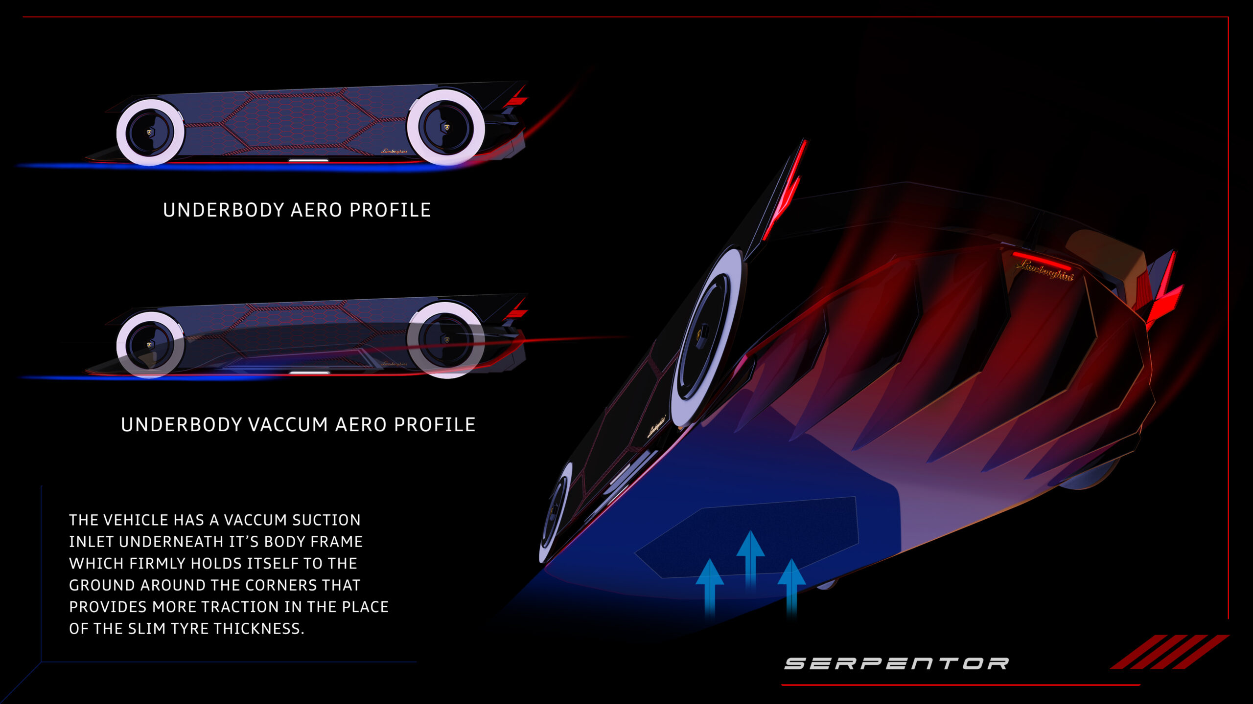 The underbody of the car is a technological marvel with a vacuum suction pump that activates itself at the corners to keep the vehicle on the ground intern creating additional traction in the place of slender omnidirectional wheels that are attached to movable side chassis constructed of graphene battery panels framed with hexagonal-shaped carbon fibre. Another key element of Serpentor is that side frames operate as rudders at the corners to balance the CG of the vehicle, which in turn is coupled to the main body using pneumatic hydraulics that offers freedom of movement like a rudder and as well as detachable but modular when needed. Moreover, the side graphene panels express themselves by displaying hexagonal shape graphics when charging which makes this car more alive.